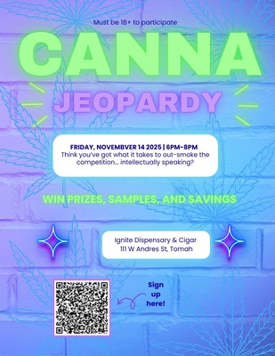 Think you’ve got what it takes to out-smoke the competition... intellectually speaking? Join us for Cannabis Jeopardy, the trivia game where the questions are high, and the answers are higher. Flex your cannabis knowledge, win prizes, enjoy samples & savings. Laugh at, or with, your friends (or yourself) and maybe learn something along the way! Come for the laughs, stay for the freebies and bragging rights. It's trivia — but with terpenes.