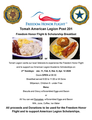 The Tomah American Legion Post 201 invites the community to enjoy a classic breakfast in support of a meaningful cause. This fundraiser helps send local veterans on the Freedom Honor Flight and supports American Legion academic scholarships. Breakfast is served on the second Sunday of the month (January–April 2026) and features biscuits and gravy or all-you-can-eat pancakes, both with scrambled eggs and bacon. $8 per person; children 6 and under eat free. Doors open at 8:30 a.m., breakfast served 9–11 a.m. or until gone.