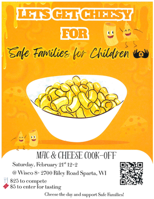 Come enjoy Mac & Cheese Cook-Off held Saturday, February 21st from 12-2pm. $25 to complete | $5 to enter for tasting. Cheese the day and support Safe Families!