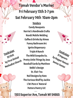 Aimee’s Hub invites the community to shop local at the Tomah Vendors Market, a free, indoor event featuring 20+ local vendors. Browse handmade items, gifts, crafts, and more during this fun Valentine’s weekend shopping experience. Open to the public and perfect for finding something special while supporting local businesses. Vendors interested in participating may reserve a space for $15 per day. Please note: the event host will never request online payment and will only accept vendor fees in person at the event location.